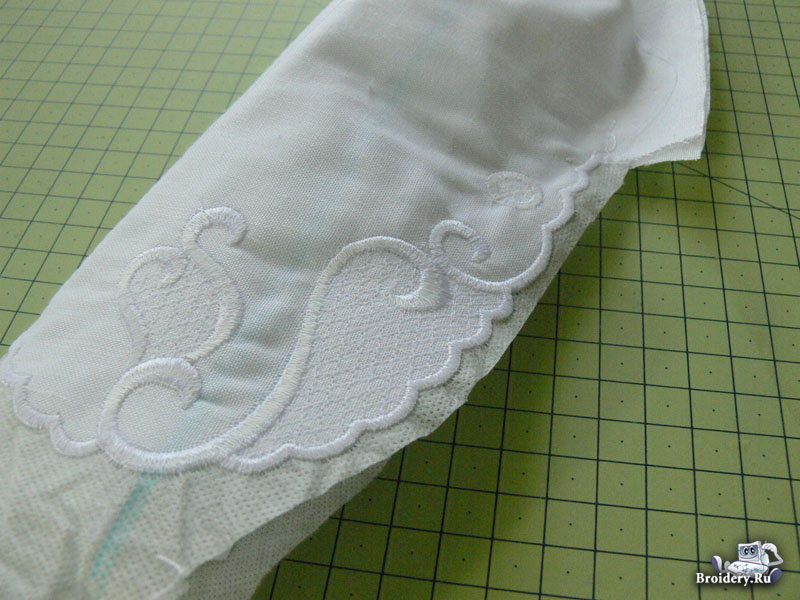 Повторите вышивку второй половинки воротника, как описано выше. По окончании вышивки, обрежьте стабилизатор близко к строчке и удалите остатки стабилизатора, прополоскав воротник в теплой воде. Вышитый воротник готов и можно украсить им изделие.