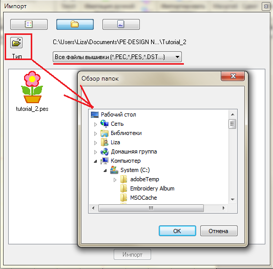 Дизайны машинной вышивки бывают разных форматов. Так уж получилось, что каждый производитель оборудования определил свой формат для машины. Намудрил закодировал... Форматы с которыми вы будете встречаться следующие: DST EXP PES PEC ART VIP и так далее. Программа PE-Design Next может открыть следующие форматы: Вложение: pe-design_lesson(244).png [ 5.86 КБ | Просмотров: 19015 ] А сохранить дизайн после открытия в следующие форматы: Вложение: pe-design_lesson(245).png [ 5.97 КБ | Просмотров: 19015 ] Допустим вы скачали дизайн в формате HUS, а ваша вышивальная машина понимает только PES 1. Откройте программу и зайдите в меню В начало>Импортировать рисунки из файла Вложение: 2. В открывшемся окне нажмите иконку Тип, чтобы открыть окно с выбором папок. Вложение: Найдите папку в которой хранятся дизайны. Все дизайны расположенные в этой папке и имеющие перечисленные выше форматы будут отражены в окне. Выберите файл, который вы хотите открыть и важды кликните по нему левой клавишей мыши, или нажмите Импорт. Закройте окно импорта дизайна. Теперь необходимо сохранить дизайн в формате понятном вашей машине. Зайдите в меню Файл-Экспорт Вложение: В открывшемся окне выберите тип файла в который вы хотите сохранить дизайн, задайте ему уникальное имя и нажмите Сохранить Вложение: