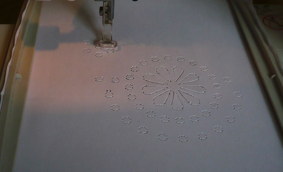За неимением набора специально заточенных игл для выполнения Ришелье в автоматическом режиме попробовала выполнить «вырубку» обычной иглой. Показываю результат (вернее, процесс): Вложение: Пяльцы 140х200, принтерная бумага, тонкая игла, скорость 400 ст/мин (была установлена для предыдущего проекта), 23 минуты, фрагмент файла из программы Digitizer MBX Cutwork. Видно, что специально заточенные иглы прорубили бы вполне ровные отверстия. По поводу времени: 23 минуты + 2 минуты (т.е. 4 раза по полминуте на смену каждой иглы) = 25. Лично я за 25 минут ножницами столько маленьких круглых отверстий (Ø 5 мм) аккуратно не вырежу. |