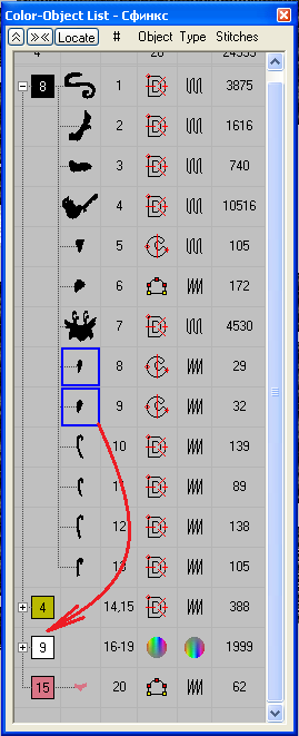 МАНИПУЛИРОВАНИЕ ОБЪЕКТАМИ. ПОНЯТИЕ ЦВЕТОВОГО ПЕРЕХОДА (СЛОЯ). Если вы читали предыдущие уроки, вы научились создавать объекты из которых состоит вышивка с помощью различных инструментов (Run, Complex Fill, Input A и т.д.). Если не читали, то оставьте этот урок на будущее и перейдите к первым шести урокам, поскольку сейчас мы будем говорить о том как менять порядок вышивания уже созданных объектов. Откройте в программе окно Color Object List Для этого кликните иконку на панели Standart Вложение: Справа откроется окно в котором будут представлены все комбинированные (стежки+вектор) или стежковые объекты, которые имеются в открытом документе, расположенные в порядке вышивания сверху вниз. В этом окне представлена подробная информация о дизайне, а именно (см. рисунок ниже)