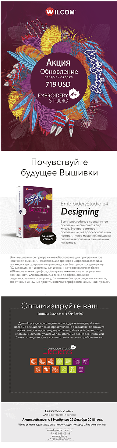 Лицензионную программу Wilcom ES e2.2 можно приобрести у наших партнеров Студия вышивки Дмитрия Адлина А также в магазине на нашем сайте BroideryShop ***В настоящий момент идет перевод последней версии программы Wilcom ES e 3. Как только перевод будет завершен, программа появится на российском рынке. Подписывайтесь на новости сайта и будьте в курсе!!! |