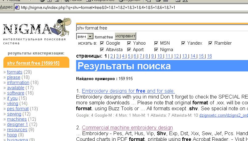 Сечас не смогу быстро на скорую руку сайты указать, но если хотите побыстрее найти, можете в любой поисковой системе сделать запрос. Мне нравиться www.nigma.ru в поле "найти" напишите например "shv format free" и вам будет предоставлена выборка. ищите сколко душе угодно. Я вот сейчас попробовала, по первым же ссылкам нашла бесплатные SHV http://www.sewterific.com/Artwork.htm http://www.husqvarnaviking.com/us/2894.htm http://www.abc-embroidery-designs.com/F ... chive.html http://www.abc-cross-stitch-patterns.co ... chive.html Ну и так далее.