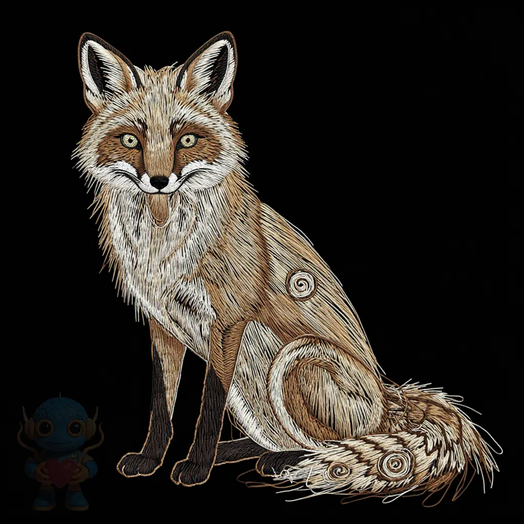 a fox sitting alertly, spiral decorative elements on tail, fine embroidery lines, low density fill