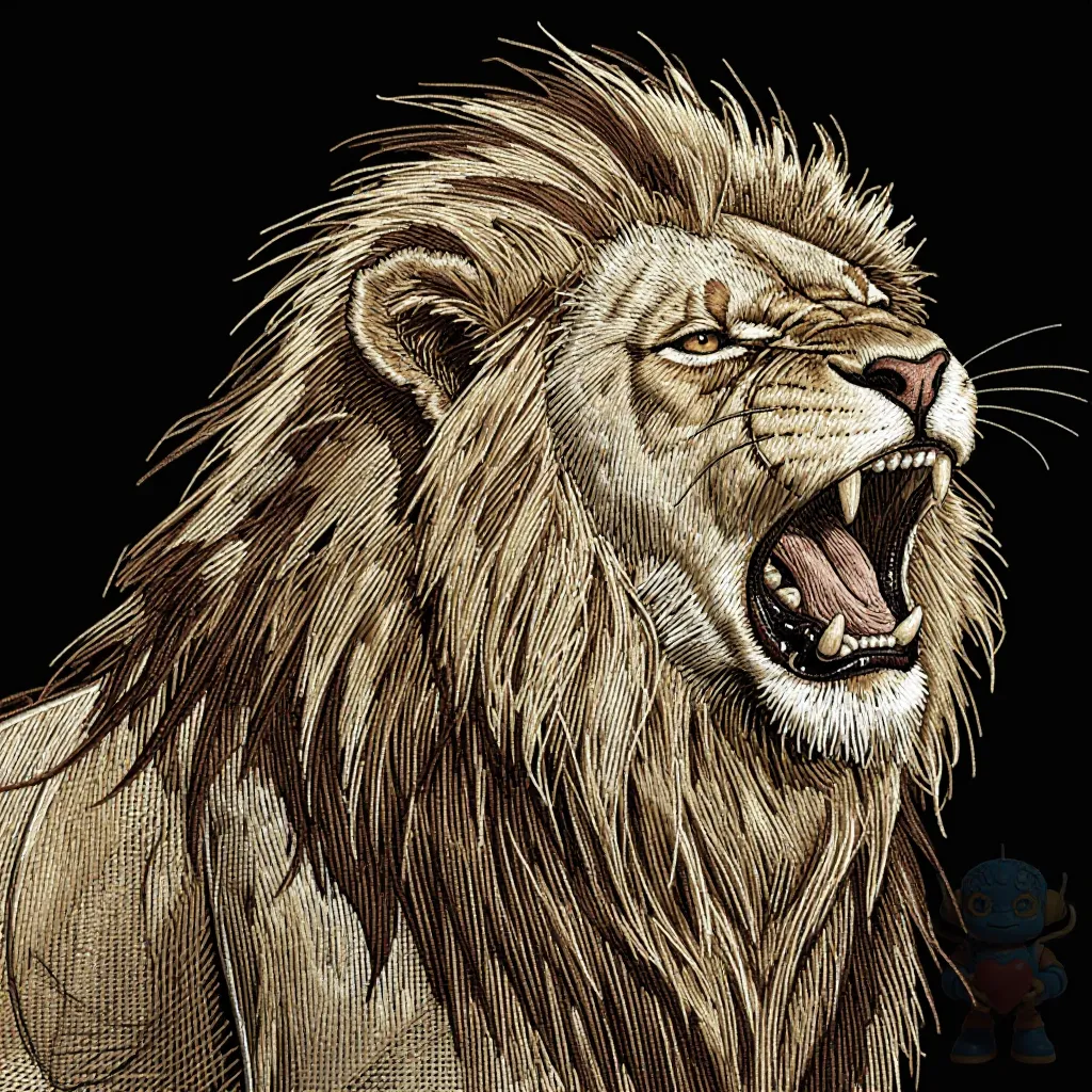 a majestic lion roaring with detailed mane flowing around head and shoulders