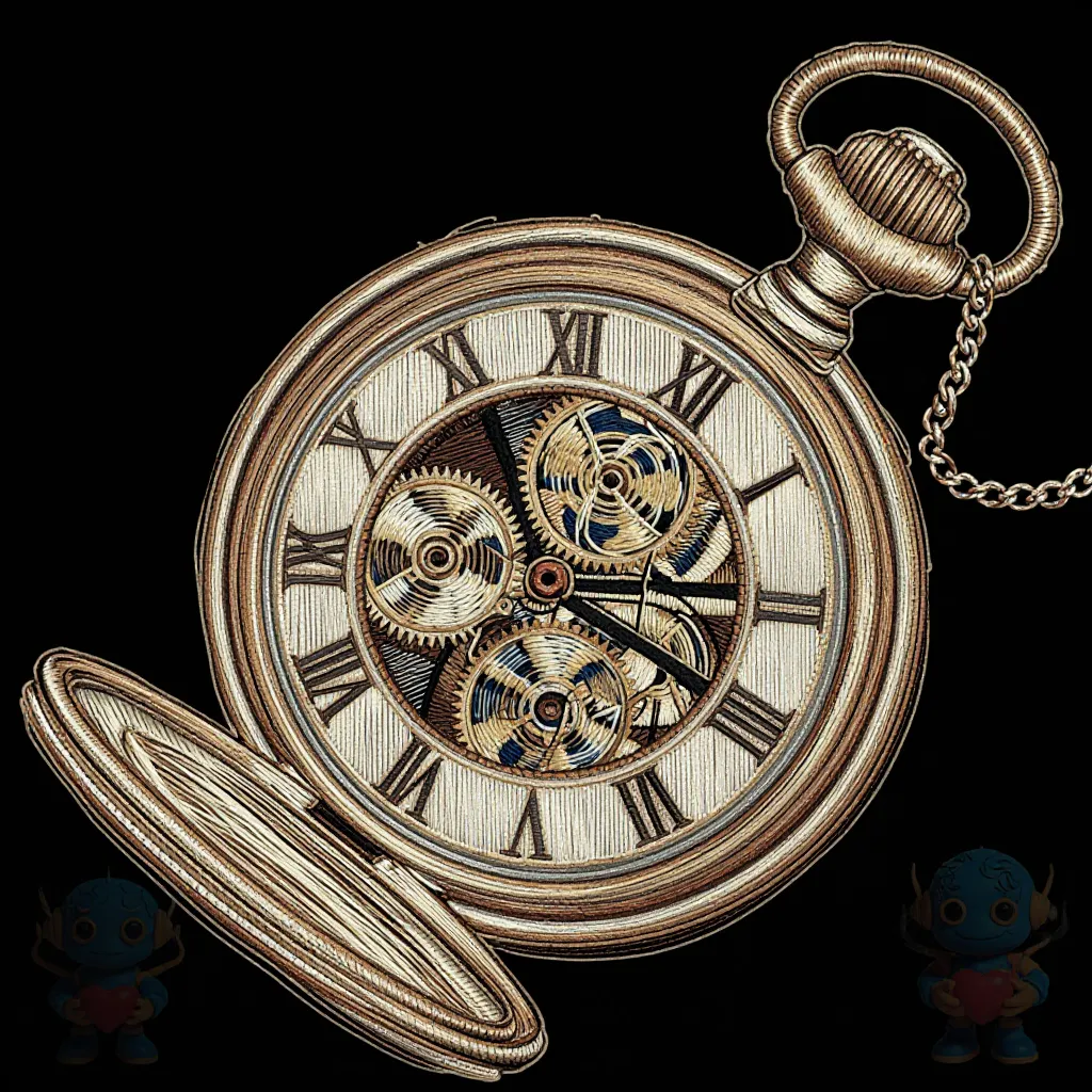 a pocket watch with intricate gears visible, chain links, Roman numerals