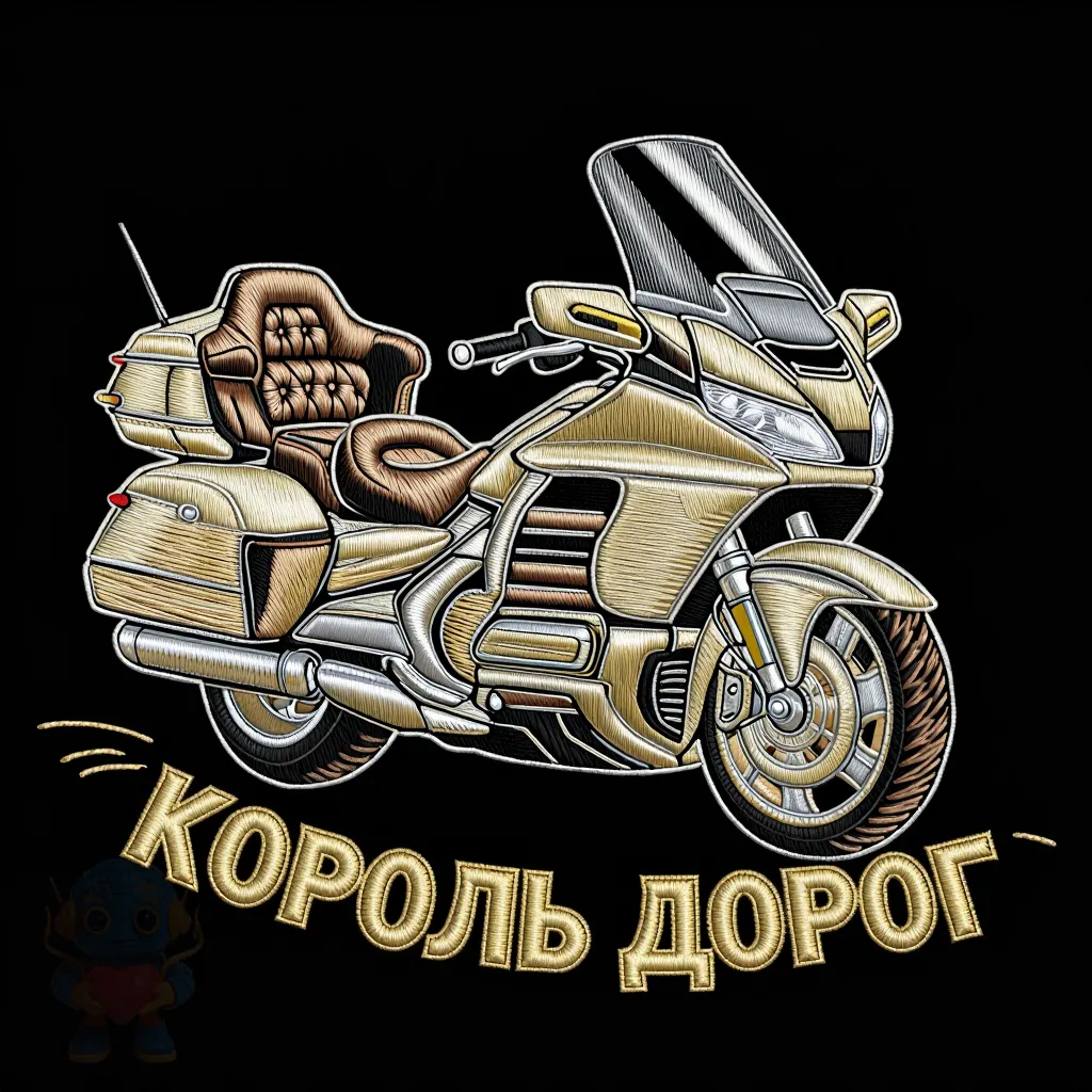 Detailed embroidery preview on black velvet. Subject: A massive Touring motorcycle (like a Goldwing or Electra Glide) with a large windshield, comfortable armchair-seats, and luggage cases. It looks majestic and stable. Stitch Definition: The large windshield is outlined in a continuous, smooth Stem Stitch in light grey. The plush seats are filled with a "tufted" pattern using Chain Stitch loops to show volume and comfort. The massive headlight is a radial Satin Stitch circle. Typography: The text "КОРОЛЬ ДОРОГ" is wide and bold, embroidered in gold Satin Stitch with a Backstitch outline, looking like a heavy badge. Vibe: Luxury, long-distance travel, solid.
