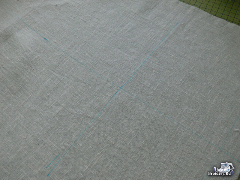 Сделайте разметку по центру рушника. С изнаночной стороны приклейте кусок отрывного клеевого стабилизатора, размером больше чем размер внешнего обода пяльцев. Запяльте изделие.