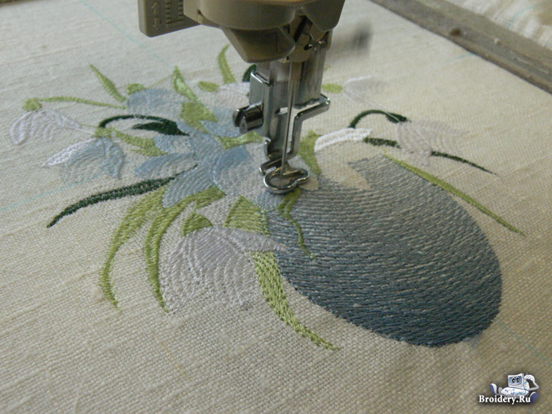 Загрузите дизайн в машину, установите пяльца. Вышейте дизайн, меняя нитки в последовательности, указанной в карте цветов, приложенной к дизайну. После вышивки удалите стабилизатор с изнаночной стороны ткани.