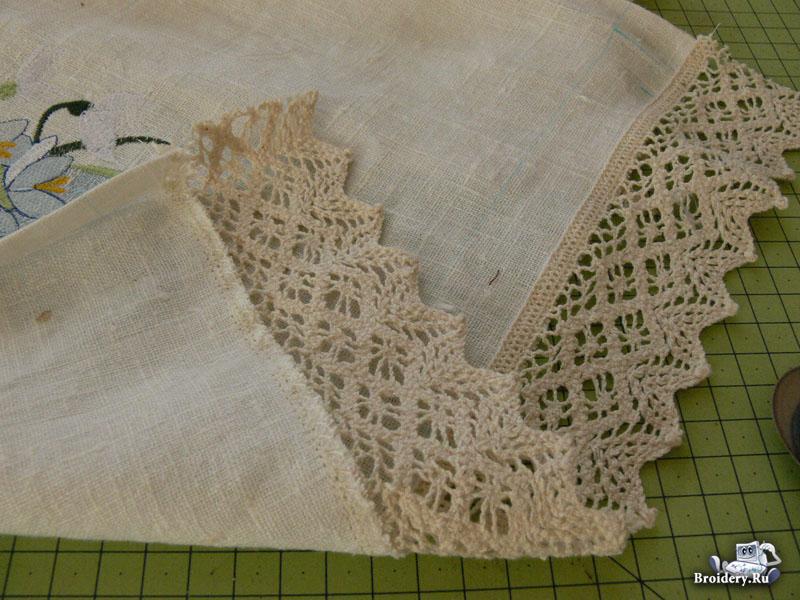 К нижнему, короткому краю полотенца приколите кружево с фестонным краем. Чтобы спрятать край кружева, подогните срез по длинной стороне полотенца на 1 см и приколите кружево от сгиба до сгиба.