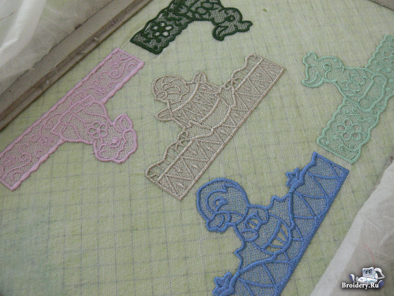 После того, как все дизайны будут вышиты, нужно вырезать их из стабилизатора с небольшим запасом стабилизатора по контуру вышитых дизайнов. Поместите вышитые дизайны в теплую воду на несколько минут. Растворять весь стабилизатор не нужно. Вышитые дизайны должны иметь небольшую жесткость, чтобы держать форму вышивки.