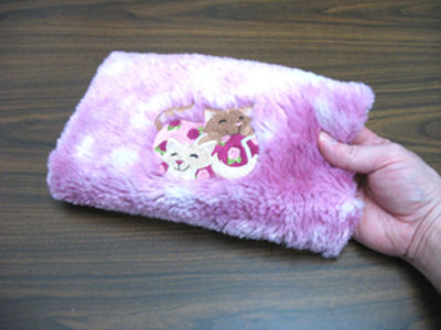 Осталось сшить теплую муфту для рук. Сложите ткань вдвое, лицевой стороной внутрь, совмещая короткие стороны. Прошейте их прямой строчкой. Чтобы избежать смещения слоев ткани во время шитья, используйте шагающую лапку.