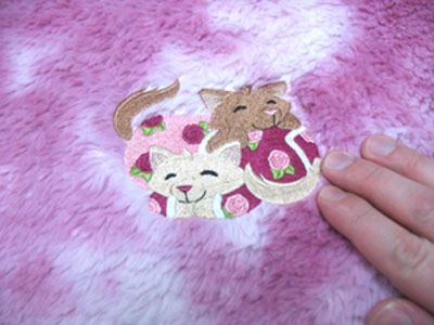 Если ворс на ткани высокий, больше 0,7 см высотой, срежьте излишки по контуру вышивки, ориентируясь на шаблон.