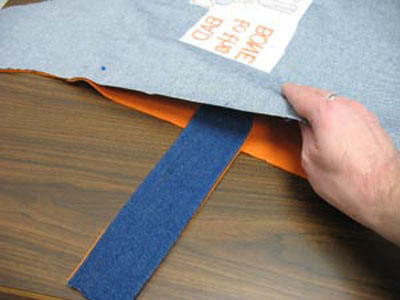 Отрежьте кусок ленты-липучки длиной 6 см. Одну сторону ленты пришейте на конце одной из застежек со стороны ткани подкладки. Отстрочите по краю ленты, чтобы закрепить её на месте. Положите на ткань для подкладки деталь верха изделия, лицевыми сторонами внутрь. Выкроите деталь из ткани подкладки. Поставьте метки центра детали, для ориентира расположения ремней. Подготовленные ремешки поместите внутрь изделия, между деталями лица и подкладки, ориентируясь на поставленные метки, соедините булавками. Установите ремни так, чтобы они были параллельны срезу. Сшейте деталь по контуру, оставив около 5 см для выворачивания детали в одном из швов.