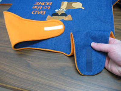 Отрежьте еще кусочек липучки длиной 6 см. Пришейте части липучки к краям частей выкройки, предназначенных для закрепления на шеи собаки.