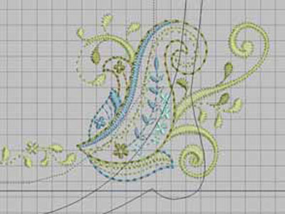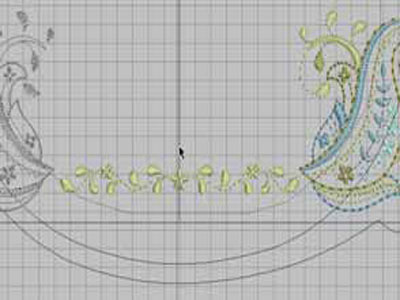 Затем сделайте зеркальное отображение дизайна пейсли, при помощи инструмента Mirror-Merge Horizontal и переместите его на противоположную сторону. Используйте центральную линию в качестве ориентира для точного размещения. Загрузите в программу дизайн №21000-15—Small Flower Head. Поместите его в правой нижней части левого рисунка пейсли рядом с завитком и немного выше границы пяльцев. Добавьте второй цветок на противоположную сторону, выполнив его зеркально.