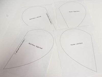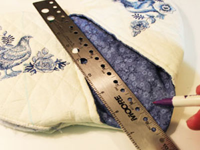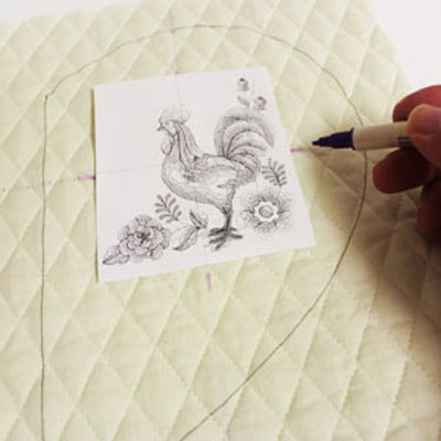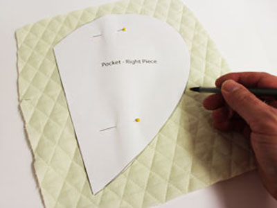 Из стеганой ткани вырежьте два квадрата, размером больше чем выкройки деталей карманов прихватки. Закрепите выкройку на ткани булавками и обведите по контуру. Распечатанный шаблон дизайна поместите на деталь в пределах контура и отметьте точки центра дизайна и его боковых сторон при помощи исчезающего маркера для ткани.