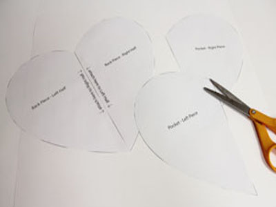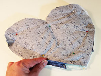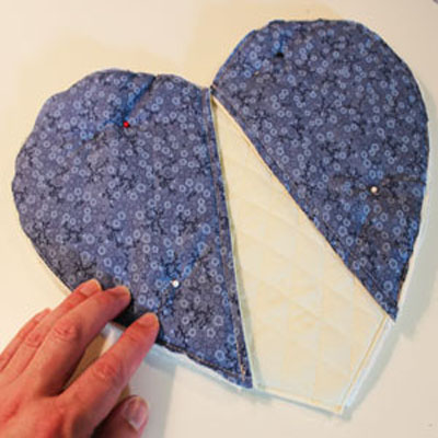 Сложите детали прихватки лицевыми сторонами друг к другу. Переверните деталь вверх карманами и поместите сверху деталь сердца из подкладочной ткани.
