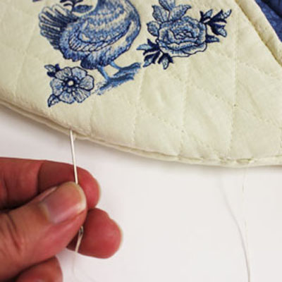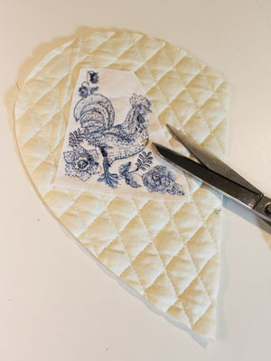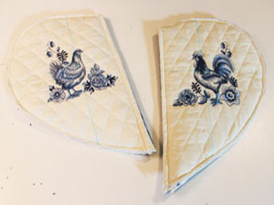 Повторите процесс вышивки для левого и правого кармана прихватки. По окончании вышивки оборвите остатки стабилизатора. Вырежьте детали прихватки. Соедините вышитые детали прихватки с такими же деталями из ткани с рисунком, лицевыми сторонами друг к другу. Выровняйте срезы и стачайте детали карманов прихватки по прямому краю на ширину припуска в 0,5 см. Выверните и приутюжьте.