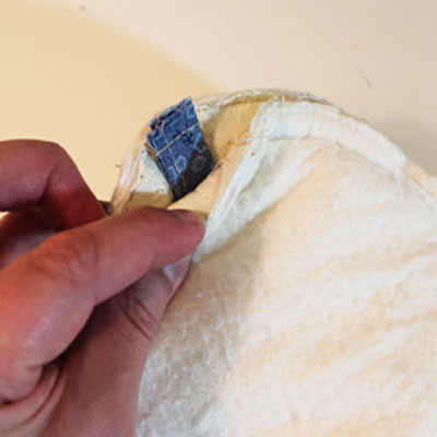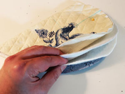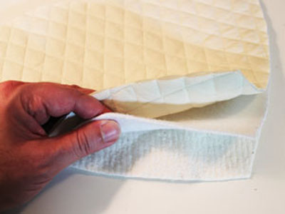 Теперь вложите внутрь карманов прихватки слой уплотнительного материала и слой ватина. Уплотнительный ватин укладывайте изоляционным слоем в сторону рук. Сшейте все слои по внешнему контуру и обрежьте излишки изоляционных слоев.