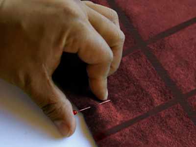 Отрежьте кусок стабилизатора размером больше, чем пяльца. Соедините стабилизатор и ткань клеем-спреем для временной фиксации. Запяльте в пяльца, совмещая линии центров на ткани с метками на пяльцах. Вышейте дизайн.