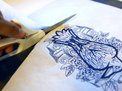 Для дизайна использовавшегося в мастер-классе понадобятся пяльца большего размера, чем размер шарфа в готовом виде. Поэтому вырезание деталей можно производить и после вышивания.