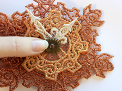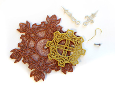 Украшение, представленное в мастер-классе, можно создать двумя разными способами. Для выполнения этого проекта необходимо предварительно вышить кружевные элементы. Как это сделать, смотрите в мастер-классе «Работаем с водорастворимым стабилизатором (флизелин)». Дизайны кружев можно приобрести у разных производителей, а можно создать самостоятельно. Научится программировать дизайны для компьютерной машинной вышивке, вы можете на курсах.