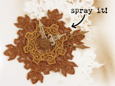 Сложите кружевные элементы друг на друга, скрепляя их между собой при помощи клеевого пистолета. Поверх положите кружевные стрелки часов и шестеренку, закрепите их гвоздиком. Металлические стрелочки приклейте за первым кружевным эелементом.