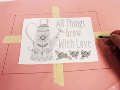 Из одноцветной клеенки вырежьте карман фартука. Это прямоугольник размером 30,5х20 см. Чтобы отметить линии середины детали наклейте на лицевую сторону детали полоски малярного скотча. Положите поверх детали распечатанный в натуральную величину шаблон дизайна. Отметьте центр дизайна и точки центров по горизонтали и вертикали.