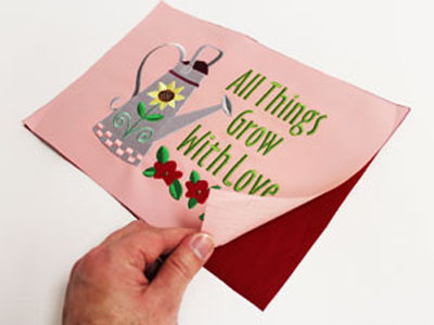 По окончании вышивки обрежьте стабилизатор и вырежьте деталь по очерченному контуру. Приклейте деталь с вышивкой на ткань для подкладки при помощи клея-спрея. Обрежьте по контуру и обработайте край детали косой бейкой из хлопчатобумажной ткани.