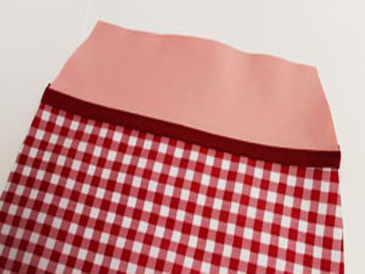 На лоскут подкладочной ткани положите лицевую часть фартука из клеенки и выкроите по ней деталь подкладки. Из хлопчатобумажной косой бейки сделайте завязки. Приколите их к верхнему и боковым срезам фартука и стачайте детали по краю. Используйте обметочную или строчку зигзаг.
