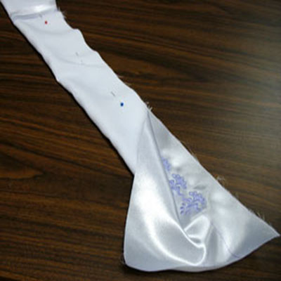 Положите ткань лицевой стороной вверх, измерьте ширину, а полученный результат разделите на 2. Отметьте несколько точек по центру полоски, а потом соедините их прямой линией. Эта линия будет сгибом детали в дальнейшем. Вышивка будет располагаться по одной из сторон полосы. Чтобы отметить линию центра для вышивки разделите сторону, где будет расположена вышивка пополам и проведите линию, дизайны вышивки будут располагаться вдоль этой линии.