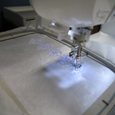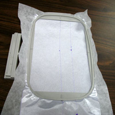 К изнаночной стороне ткани приклейте отрывной клеевой стабилизатор. Запяльте ткань в пяльца, совмещая линии центров на ткани и метки центров на пяльцах. Если вы используете неклеевой стабилизатор, вам нужно нанести на него слой клея-спрея и приклеить к стабилизатору ткань, изнаночной стороной вниз. Установите пяльца в машину, при необходимости переместите дизайн так, чтобы игла оказалась точно в центре пересечения линий. Вышейте дизайн.
