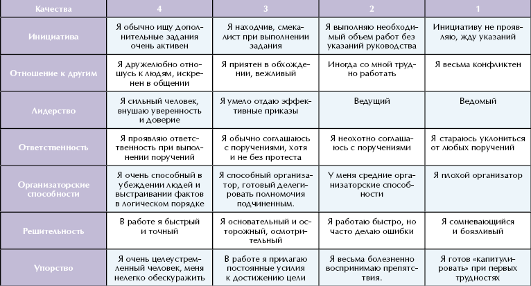 Выберите в каждой из горизонтальных граф — то определение ваших качеств, которое, на Ваш взгляд, более всего Вам подходит. Пометьте его цифрой, соответствующей вертикальной колонке (4, 3, 2, 1).
