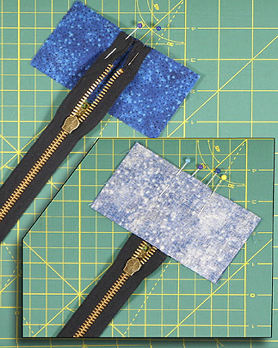 На концы молнии пришейте по два, с изнаночной и лицевой стороны, прямоугольники размером 5х8 см. Пришивая верхний край застежки-молнии, немного раскройте ее, чтобы бегунок не попал по строчку. Пришив прямоугольники выверните их, приутюжьте и обрежьте.