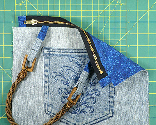 Если приобретенные вами ручки короче, чем нужно удлините их. Для этого выкроите четыре полоски ткани из джинсов размером 13х5 см и восемь длиной 12 см. Сшейте детали вместе так, чтобы получилось четыре хлястика. Хлястики сложите пополам и отметьте середину, вложите хлястики в держатели на готовых ручках. Просточите хлястики вместе, чтобы закрепить их на ручках сумки.