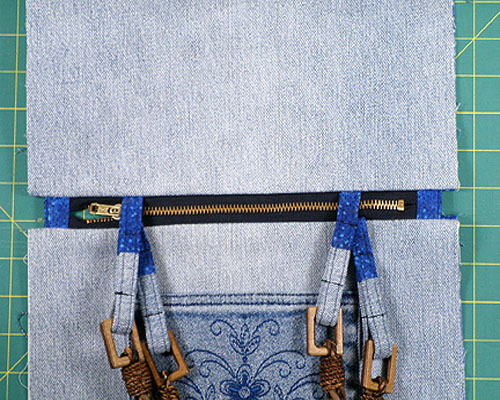 Затем пришейте молнию к верхнему краю сумки, используя стандартную лапку для вшивания молний. После этого пришейте деталь из ткани для подкладки. Повторите для второй стороны сумки.