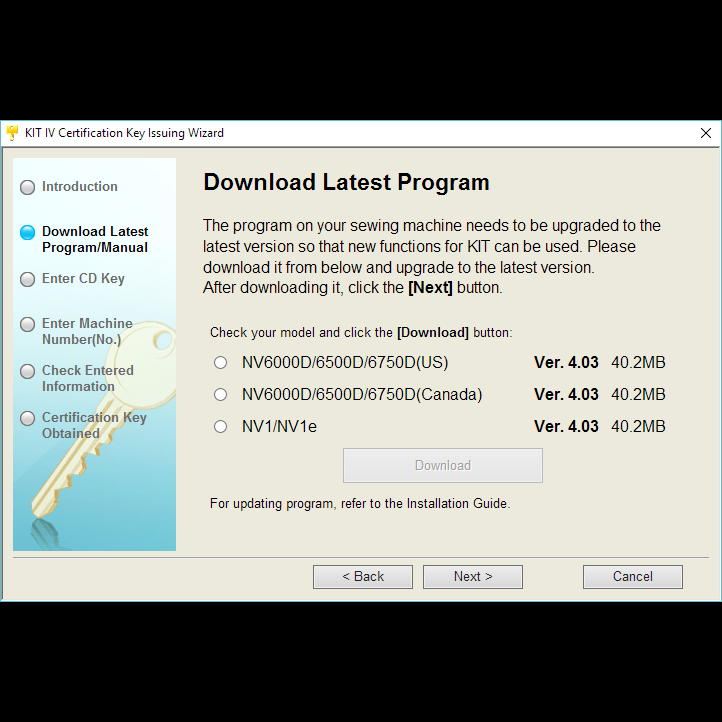 Для того, чтобы установить KIT IV, ваша машина должна иметь последнее программное обеспечение, поэтому в этом окне вы должны выбрать модель вашей швейно-вышивальной машины и нажать Download. В РФ название машинки На сегодняшний день последняя версия ПО 4.04 (24.02.2015). Эта версия выше, чем версия указанная в обновлении. Если вы уже установили обновление, то нажимать кнопку Download не имеет смысла и вы можете перейти к следующему шагу, нажав клавишу Next. Узнать о последней версии ПО машины можно на официальном сайте компании Brother