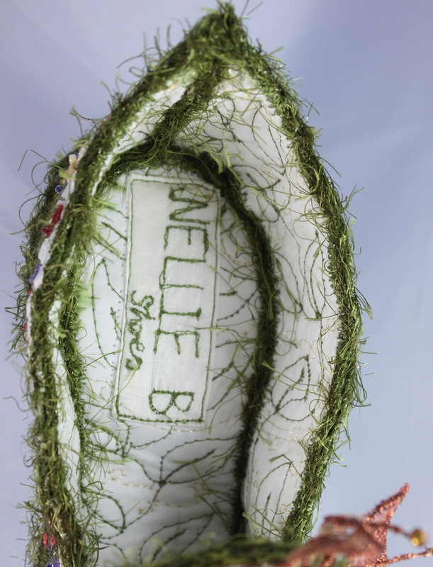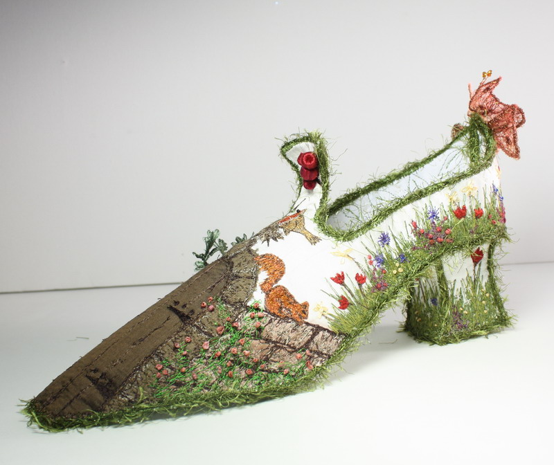 Оказалось, что волшебные туфельки вышиты художником по текстилю Нелл Бернс (Nell Burns) в свободно-ходовой технике. Вдохновением для нее послужил роман Ф.Э. Бернетт «Таинственный сад» (F.E. Burnett “The Secret Garden”) А сами башмачки Нелл назвала «Прогулка в Таинственный сад». На сайте художницы нашлась и сумочка из этой же серии, лейка, коробочка и другие вещицы «проросшие» вышитой травой.