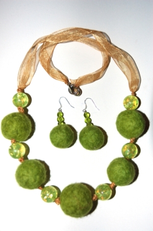 Небольшое дополнение: лента из органзы вставлялась в "бусины" из фетра с помощью иголки с широким ушком (чтобы лента вставилась без труда). Предварительно я проделывала в "бусинах" дырки с помощью иглы для фельдцевания, но одна иголка таким образом сломалась и я пришла к выводу, что для такого применения нужно шило, чтобы сделать отверстие пошире, так как иголку с лентой (сложенной вдвое!) приходилось вытягивать с другой стороны "бусины" с помощью плоскогубцев... |