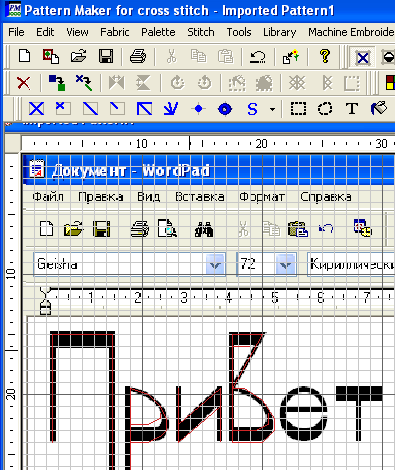 Чуть позже выложу статью на сайт из журнала Бройдери с подробным описанием как создавать свои собственные шрифты в программе. Здесь пока добавлю: Удобнее всего, при создании шрифтов пользоваться готовой картинкой, которую вы можете получить например, таким способом: === 1. Откройте любой текстовый редактор, например, Ms Word 2. Выберите шрифт и с помощью шрифта напечатайте все буквы и символы которые будут присутствовать в вашем будущем шрифте. Выделите все буквы и задайте такой размер, чтобы на экране были видны все буквы и знаки. Вложение: 3. Нажмите на клавиатуре клавишу Prt Scrn (верхний ряд клавиш. Копирует изображение на рабочем столе) 4. Теперь откройте программу зайдите в меню File - Impotr Image. Среди предложенных вариантов импорта изображения выберите вариант Clipborad Вложение: 6. Зайдите во вкладку Metod и поставьте галочку только возле Including image for tracing. Затем нажмите Import и посмотрите устраивает ли вас размер будущего текста или шрифта Вложение: 7. Если да, закройте окно экспорта изображения и приступайте к созданию надписи или шрифта. Если нет... 8. Перейдите во вкладку Size и установите поменяйте размер. Нажмите Import. Проделайте эту операцию пока размер картинки для обработки шрифта не будет удовлетворять вашей задаче. Вложение: 9. Затем закройте окно экспорта изображения. Возьмите в руки нужный инструмент и создайте надпись или шрифт. Вложение: