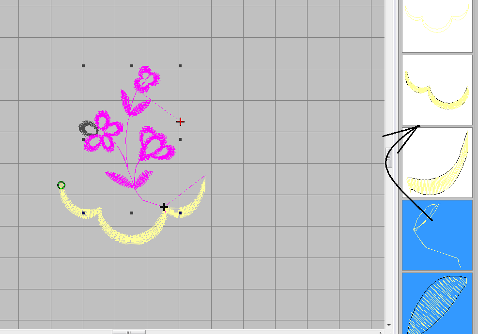 Теперь пришла пора поменять порядок вышивания цветка. В окне Color Film выделите все детали относящиеся к цветку и перетащите их в порядке вышивания между первой частью гладьевого валика и второй.