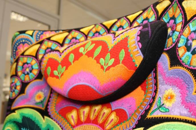 Работы участников были бесподобны: творческий замысел, цветовая композиция, реализация. Очарование, восхищение и подпитка вдохновения — вот как я могу охарактеризовать работы конкурсантов. Организаторы мероприятия дополнили галерею Конкурсных работ и другими произведениями мастеров из-за рубежа, а также Ярославской вышивальной фабрики. Масштабы некоторых работ, например панно «Драконы» 2,5х2,5 метра, не могли не удивить меня, обладательницу скромной бытовой вышивалочки. Но оказывается и на бытовых машинах можно сделать великолепные работы, к примеру, декорировать вышивкой металликом шлейф бархатного бального платья. Панно «Птицы» с имитацией эмалированной и черненой чеканки завоевало симпатии зрителей, яркое кресло каждый мысленно примерял в интерьере своего дома, сумочку с острыми перцами мечтала унести каждая представительница прекрасного пола. Живые глаза вышитых портретов и икон, мельчайшие элементы натюрмортов, детальная проработка, оригинальность — членам жюри пришлось основательно потрудиться, чтобы сделать выбор среди множества прекрасных работ.