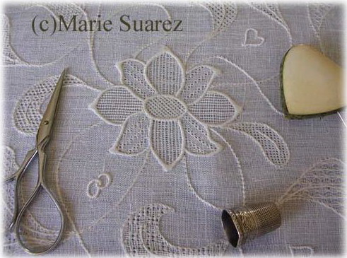 Мари Саурес (Marie Suarez), медсестра по образованию всегда питала любовь к рукоделию. Долгое время вышивка оставалась для нее не более чем хобби. Сегодня страсть Мари к кружевам, которая берет свое начало еще в раннем детстве, стала ее работой. Являясь мастером-самоучкой, она освоила различные техники вышивки и кружева, изучив бесчисленное количество книг, посетив множество музеев и выставок. Постепенно вышивка наполнила все ее существование и стала смыслом жизни для Мари. В Бельгии, где она живет со своей семьей, ее работы пользуются большой популярностью и не малым спросом.