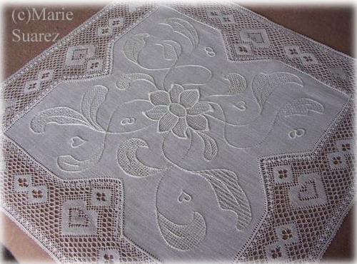 Мари Саурес (Marie Suarez), медсестра по образованию всегда питала любовь к рукоделию. Долгое время вышивка оставалась для нее не более чем хобби. Сегодня страсть Мари к кружевам, которая берет свое начало еще в раннем детстве, стала ее работой. Являясь мастером-самоучкой, она освоила различные техники вышивки и кружева, изучив бесчисленное количество книг, посетив множество музеев и выставок. Постепенно вышивка наполнила все ее существование и стала смыслом жизни для Мари. В Бельгии, где она живет со своей семьей, ее работы пользуются большой популярностью и не малым спросом.