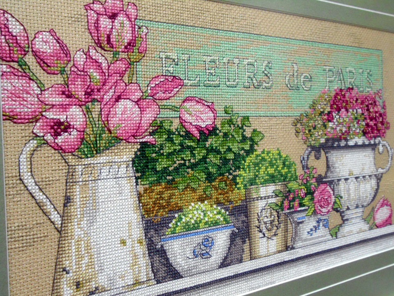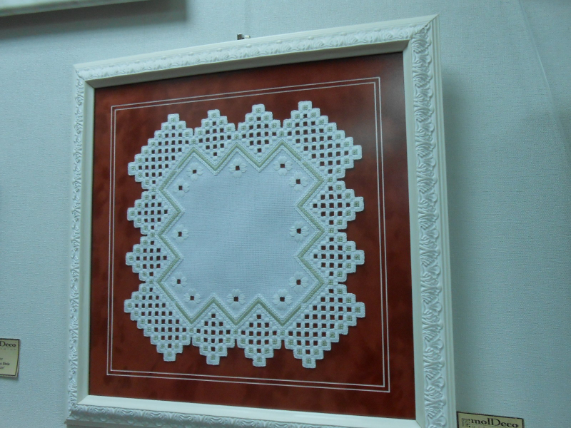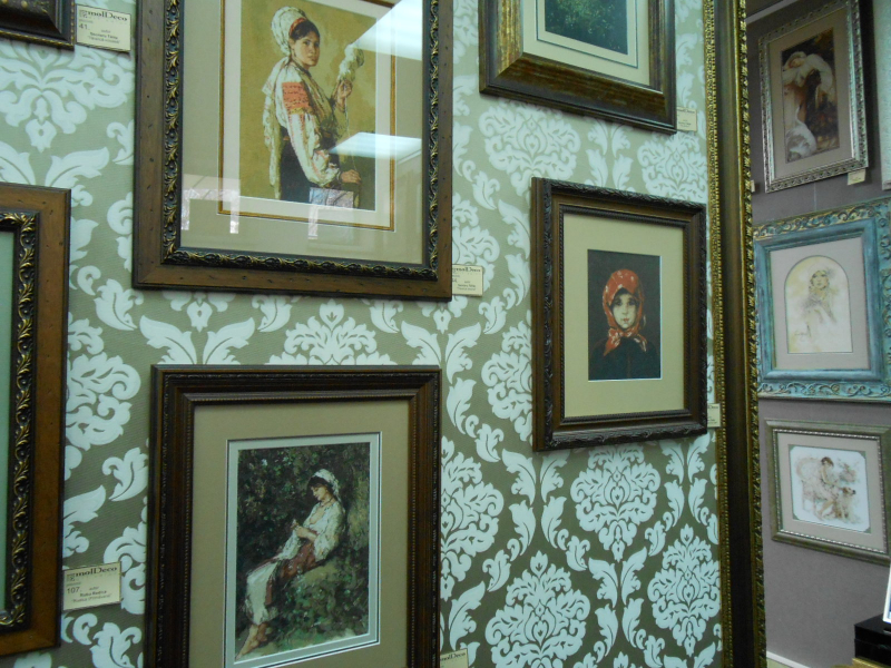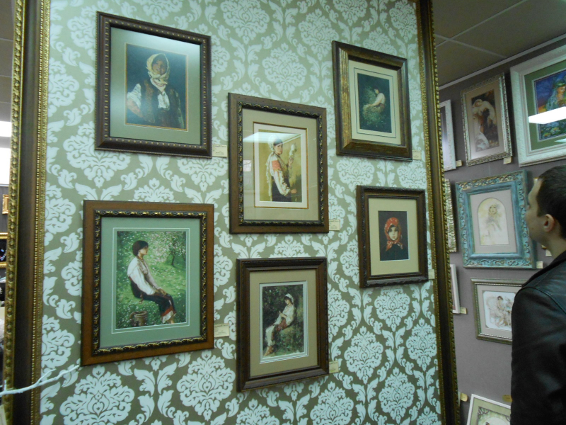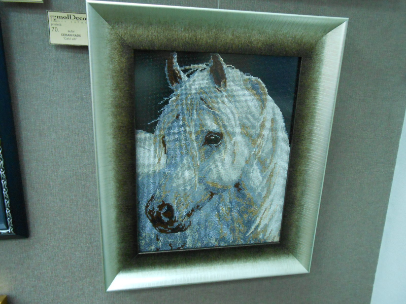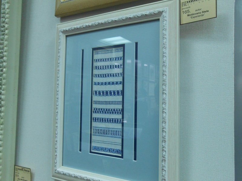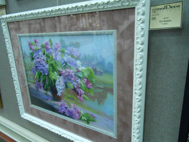 Салон частный и при нем есть багетная мастерская. Идея организации выставки у владелицы салона родилась потому, что процентов восемьдесят из заказчиков оформляют вышитые картины. Работ в салоне было много, но превалирующая часть — это вышитые картины. Вышивка крестом, причем самая разнообразная от крупного крестика шерстяными нитками на картине 1905 года с изображением роз (самой старой из экспонатов), до очень мелкого, едва заметного, который я сразу и не разглядела, подумав, что это просто рисунок. Надо сказать, что в сундуках моих бабушек (обе разных национальностей, но обе жили на юге Молдовы) были изделия с таким же узором из роз, как и на вышитой картине, представленной на экспозиции, разница была лишь в цветовой палитре. Думаю, что век назад это был характерный для Молдовы орнамент.