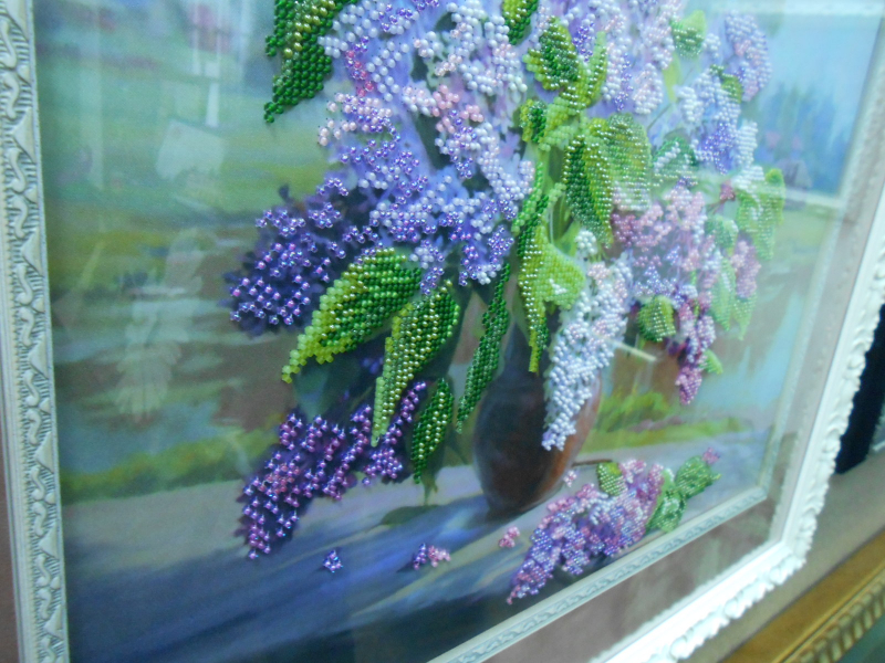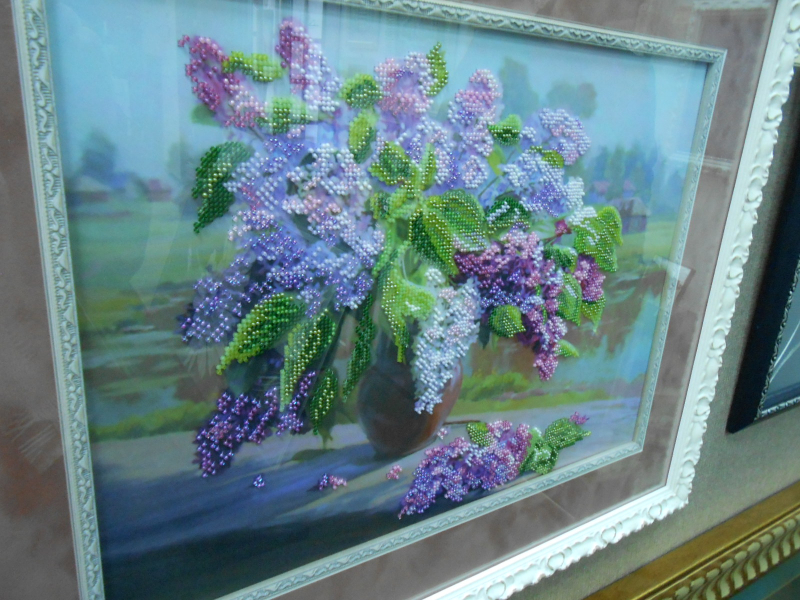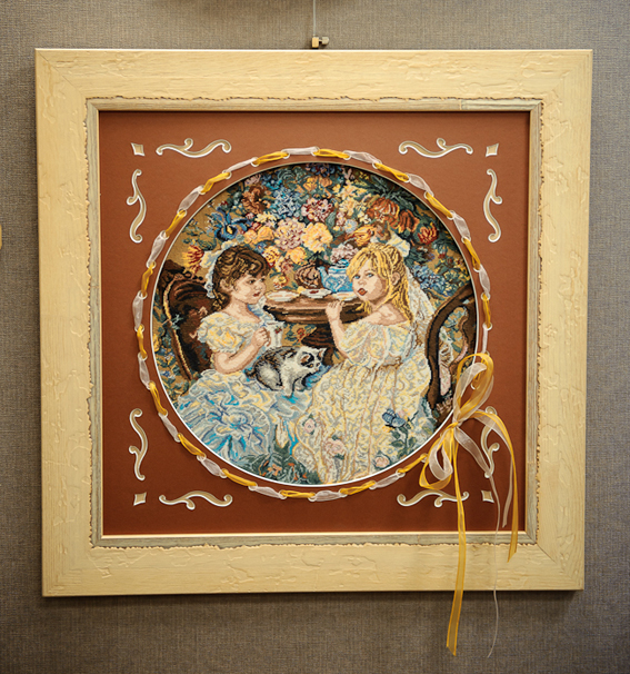 Были и репродукции других известных картин, разных художников, таких как «Джоконда», «Всадница» и другие, все искусно вышитые крестом. Вышитые пейзажи, портреты, коллажи, монохром, заполняли стены студии. Кроме вышивки крестом были работы вышитые лентами, гладью и строчкой, а также вышивки, в которых были совмещены несколько техник сразу. Глаза разбегались, в попытке рассмотреть каждую картину, отметить цветовые нюансы, аккуратность стежков, мастерство вышивальщиц и одного вышивальщика бисером, работа которого также была отобрана среди многих вышивок, которые были присланы организаторам вышивки на предварительный отбор.