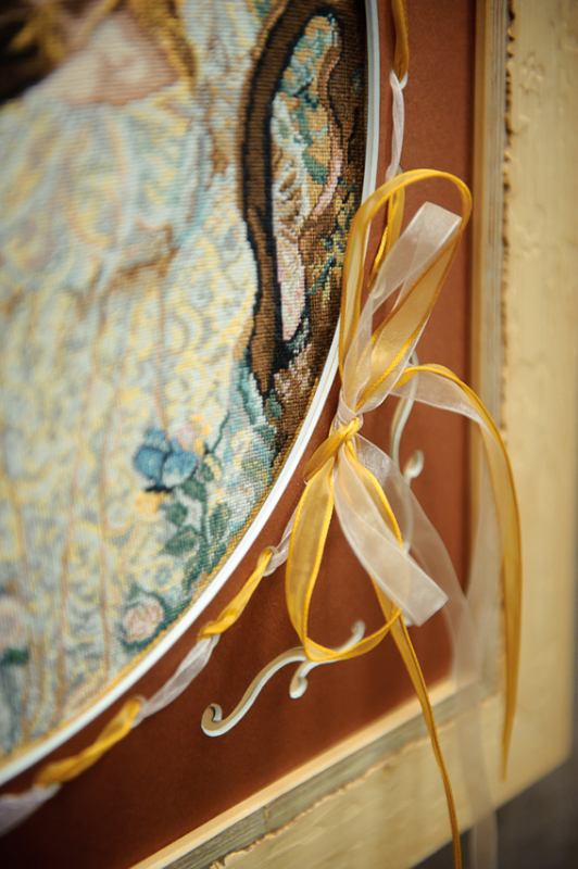 Стул с обивкой вышитой крестомМне очень понравился стул, с мягкой обивкой, сиденье, спинка и подлокотники, которого были украшены вышивкой. Он будто случайно попал в салон, каким-то чудным образом переместившись из дворцов французских королей в современный интерьер не большой галереи. Объектив фотоаппарата не может передать всей прелести этого, не побоюсь назвать, предмета искусства. К сожалению, работники студии не могли мне ничего рассказать об истории этого экспоната и мое любопытство осталось не удовлетворено, но моя богатая фантазия позволила сочинить не одну интересную историю, пока я любовалась вышитым предметом интерьера.