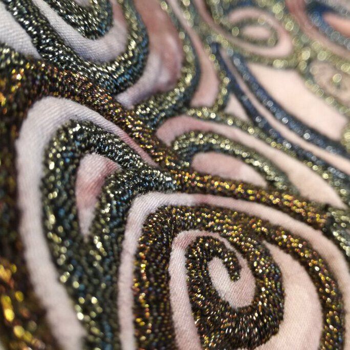 На выбор предлагается невероятно широкий ассортимент цветов для работы по самым сложным модельерским проектам. Цветовая гамма ниток вышивальных Metallic №40 Madeira основанная на базе цветов драгоценных металлов, дополненная сложными тонами астро. Очень важно при работе с металлизированными нитями выбор игл. Нужно использовать специальные иглы, с удлиненным ушком и лучшим качеством полировки, с обычной иглой нить может рваться и расслаиваться. Рекомендуются иглы номера: №80/12, 90/14, 100/16. Например, можно использовать следующие специальные иглы: