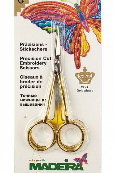 Ножницы изогнутые Madeira c позолочнными ручками для подрезки нитей при машинной, ручной вышивке, аппликаций. Специальная форма этих точных ножниц позволяет без проблем работать на всех видах ручных, машинных, вышивальных работах. Позволят с легкостью обрезать нить в труднодоступных местах, например под лапкой. Двойной изгиб позволяет избежать прикосновения пальцами к ткани. Инструмент гарантирует точную работу и элегантность.