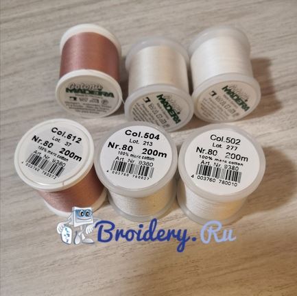 Для филигранной вышивки и вышивки букв рекомендуем тонкие нитки Madeira COTONA №80. Предназначены для исполнения мелких, филигранных вышивок, монограмм на галстуках и носовых платках и на особо тонких и неординарных тканях.